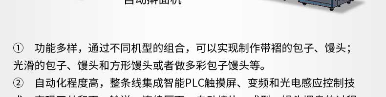智能包子饅頭生產(chǎn)線,功能多樣,通過不同機(jī)型的組合,可以實(shí)現(xiàn)制作帶褶的包子、饅頭;光滑的包子、饅頭和方形饅頭或者做多彩包子饅頭等