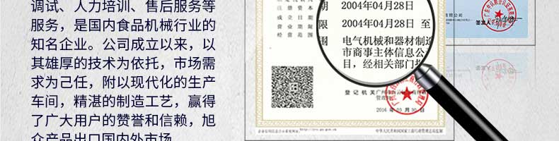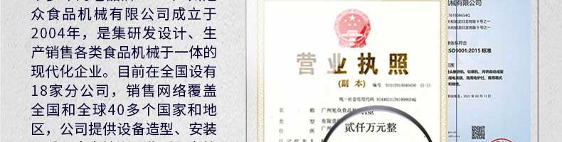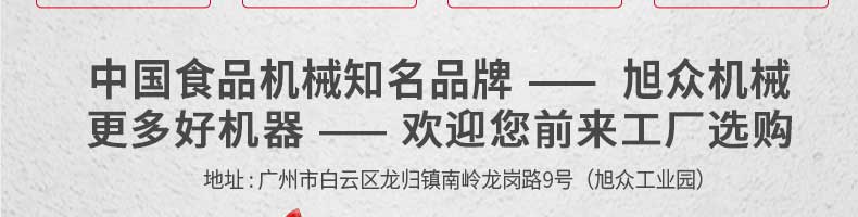 廣州旭眾食品機(jī)械有限公司是一家集科研開發(fā),生產(chǎn)設(shè)計(jì),營銷服務(wù)為一體的現(xiàn)代化生產(chǎn)企業(yè)?,F(xiàn)代化生產(chǎn)車間,精湛制造技術(shù),所產(chǎn)機(jī)械歷經(jīng)市場重重考驗(yàn),不斷贏得海內(nèi)外客戶的贊譽(yù)。