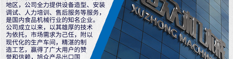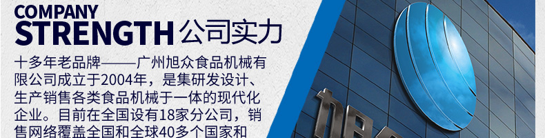 廣州旭眾食品機(jī)械有限公司是一家集科研開發(fā),生產(chǎn)設(shè)計,營銷服務(wù)為一體的現(xiàn)代化生產(chǎn)企業(yè)。現(xiàn)代化生產(chǎn)車間,精湛制造技術(shù),所產(chǎn)機(jī)械歷經(jīng)市場重重考驗,不斷贏得海內(nèi)外客戶的贊譽(yù)。
