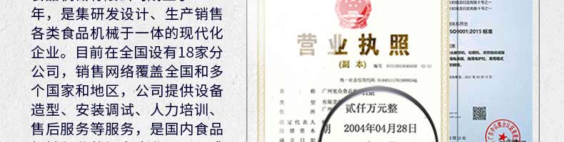 廣州旭眾食品機械有限公司是一家集科研開發(fā),生產(chǎn)設(shè)計,營銷服務(wù)為一體的現(xiàn)代化生產(chǎn)企業(yè)?,F(xiàn)代化生產(chǎn)車間,精湛制造技術(shù),所產(chǎn)機械歷經(jīng)市場重重考驗,不斷贏得海內(nèi)外客戶的贊譽。