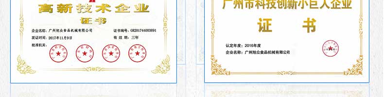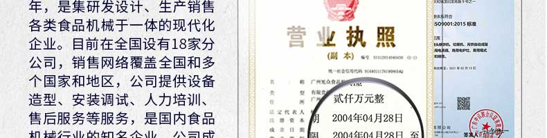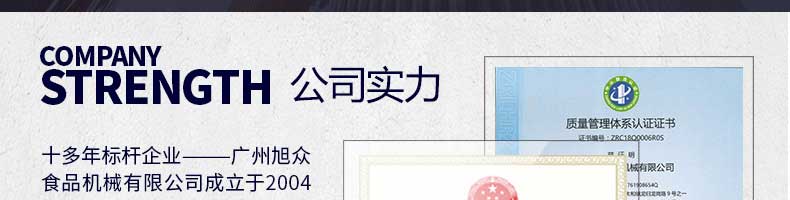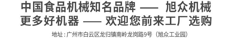 廣州旭眾食品機械有限公司是一家集科研開發(fā),生產設計,營銷服務為一體的現(xiàn)代化生產企業(yè)?,F(xiàn)代化生產車間,精湛制造技術,所產機械歷經市場重重考驗,不斷贏得海內外客戶的贊譽。