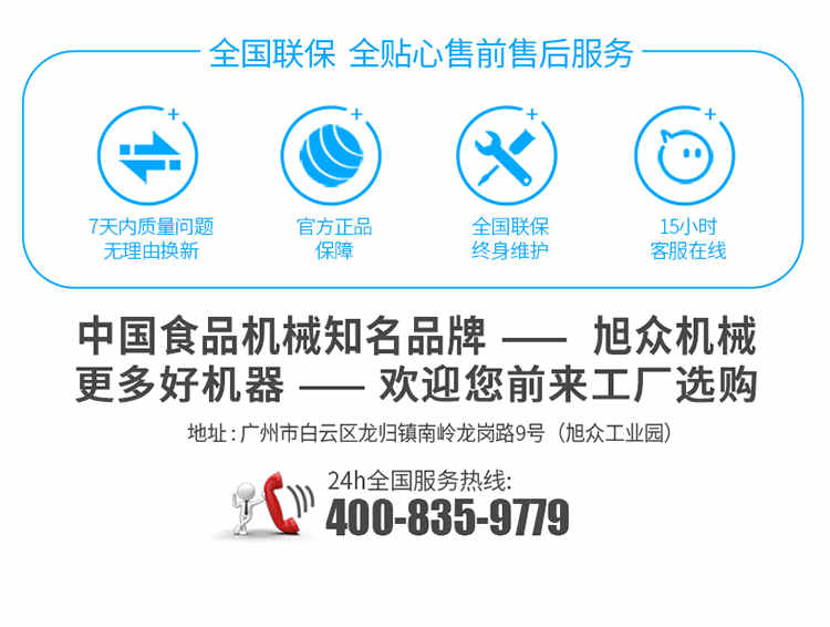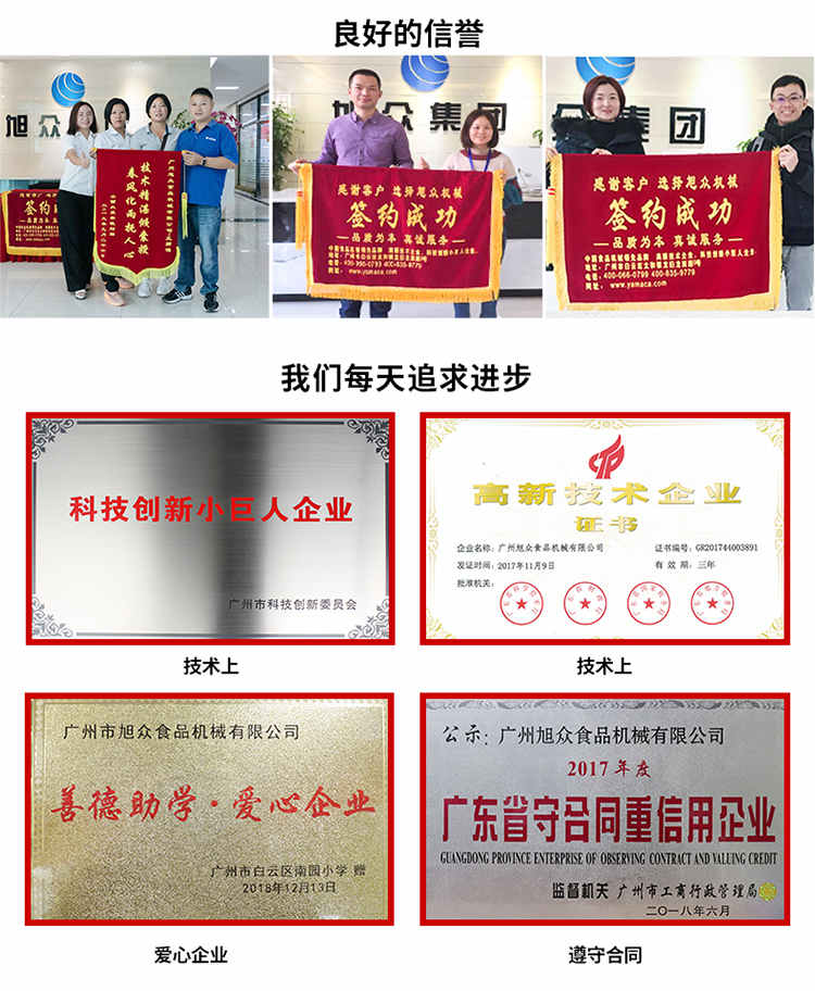 廣州旭眾食品機(jī)械有限公司是一家集科研開發(fā),生產(chǎn)設(shè)計,營銷服務(wù)為一體的現(xiàn)代化生產(chǎn)企業(yè)。現(xiàn)代化生產(chǎn)車間,精湛制造技術(shù),所產(chǎn)機(jī)械歷經(jīng)市場重重考驗,不斷贏得海內(nèi)外客戶的贊譽(yù)。