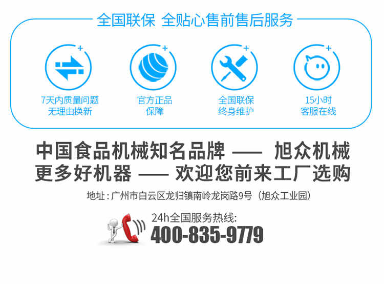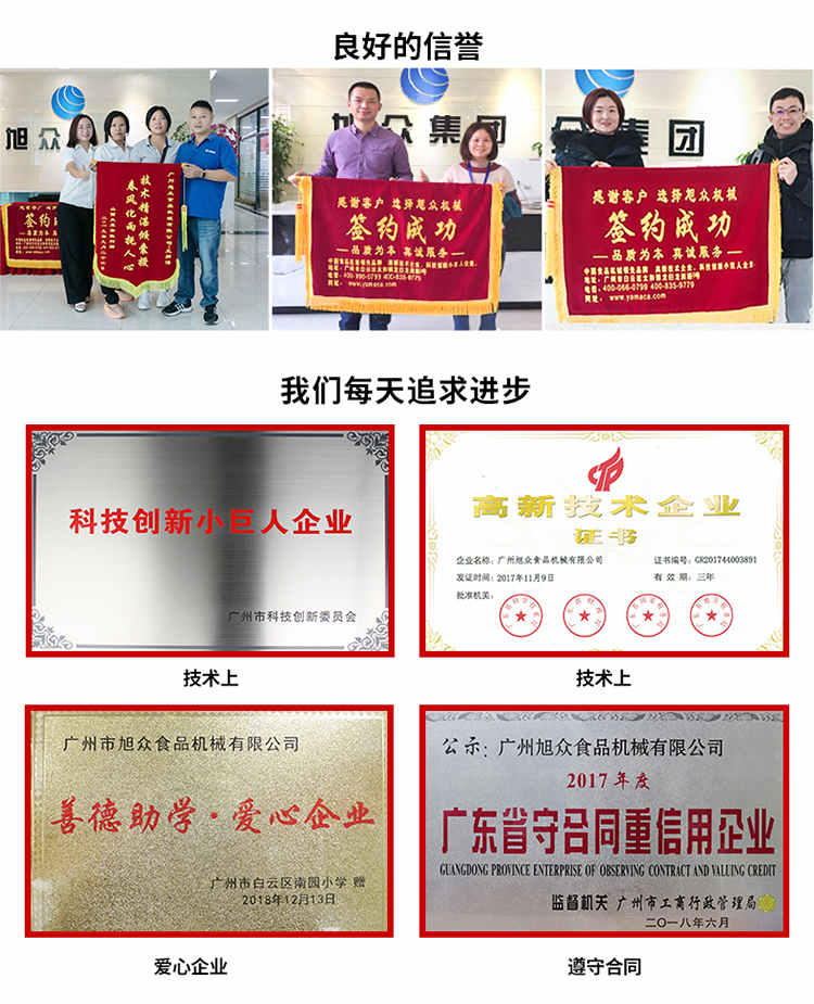 廣州旭眾食品機(jī)械有限公司是一家集科研開發(fā),生產(chǎn)設(shè)計,營銷服務(wù)為一體的現(xiàn)代化生產(chǎn)企業(yè)。現(xiàn)代化生產(chǎn)車間,精湛制造技術(shù),所產(chǎn)機(jī)械歷經(jīng)市場重重考驗,不斷贏得海內(nèi)外客戶的贊譽(yù)。