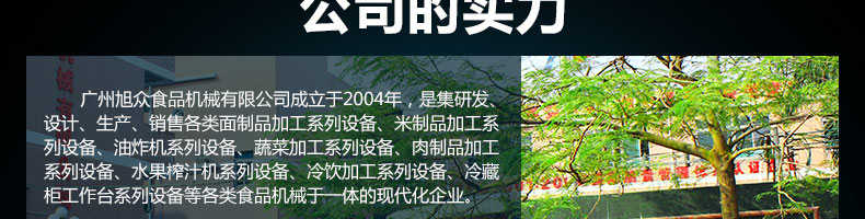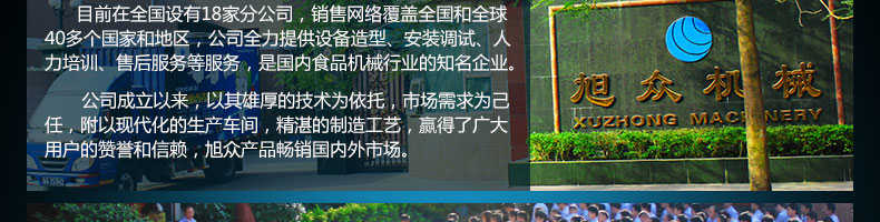 廣州旭眾食品機(jī)械有限公司是一家集科研開(kāi)發(fā),生產(chǎn)設(shè)計(jì),營(yíng)銷服務(wù)為一體的現(xiàn)代化生產(chǎn)企業(yè)?,F(xiàn)代化生產(chǎn)車間,精湛制造技術(shù),所產(chǎn)機(jī)械歷經(jīng)市場(chǎng)重重考驗(yàn),不斷贏得海內(nèi)外客戶的贊譽(yù)。