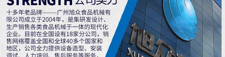 廣州旭眾食品機(jī)械有限公司是一家集科研開(kāi)發(fā),生產(chǎn)設(shè)計(jì),營(yíng)銷(xiāo)服務(wù)為一體的現(xiàn)代化生產(chǎn)企業(yè)?,F(xiàn)代化生產(chǎn)車(chē)間,精湛制造技術(shù),所產(chǎn)機(jī)械歷經(jīng)市場(chǎng)重重考驗(yàn),不斷贏得海內(nèi)外客戶的贊譽(yù)。